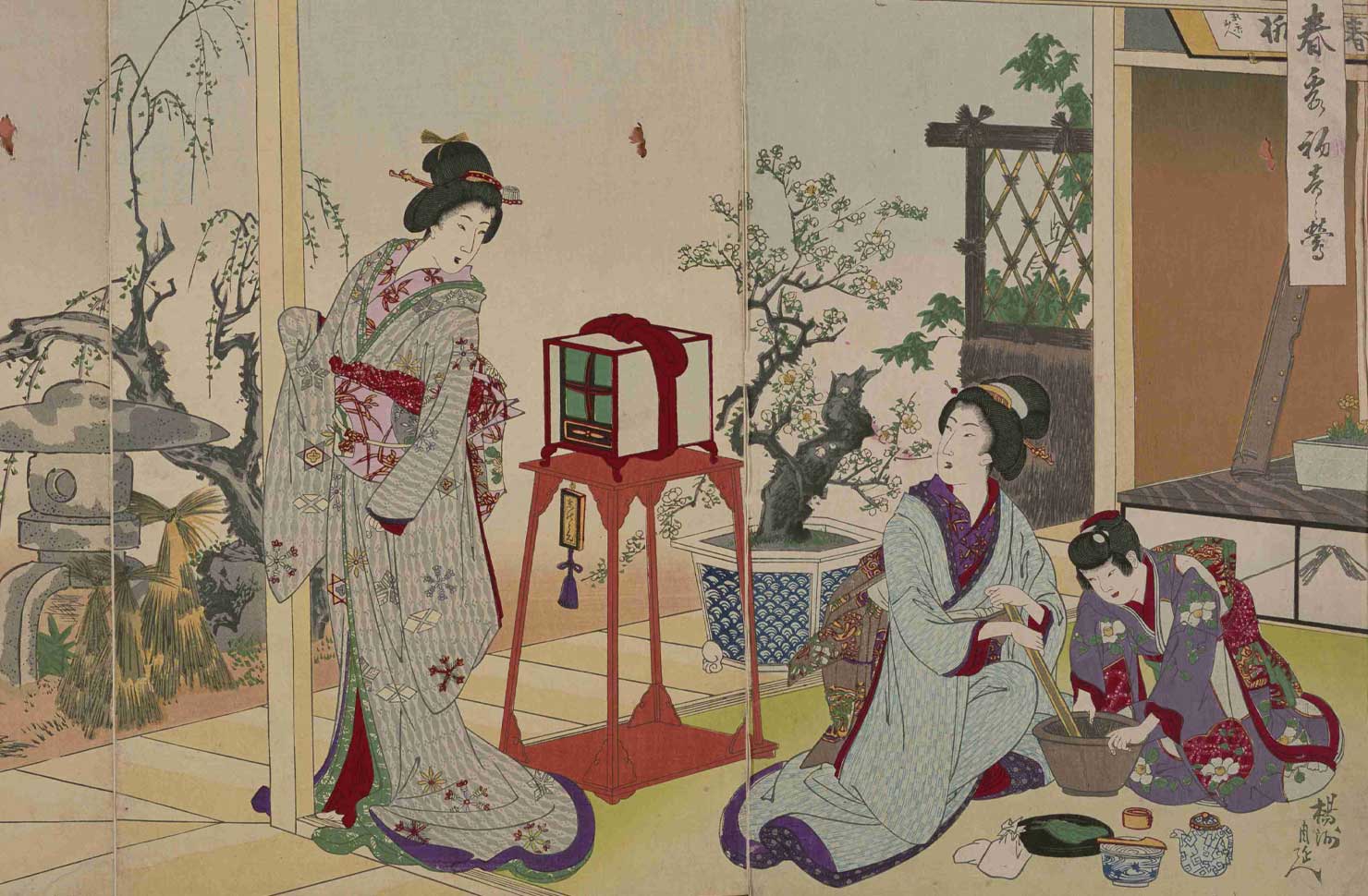 楊洲周延「春霞初音の鶯(部分)」(東京都立中央図書館所蔵)